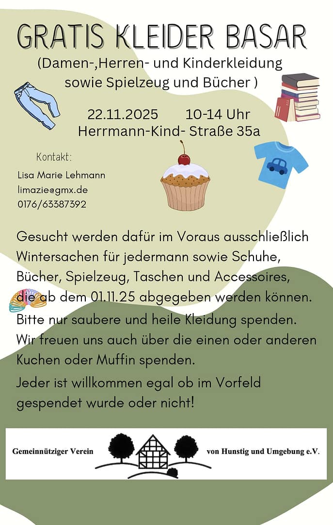 Am 22. November findet der zweite Kleider Tauschbasar von 10 bis 14 Uhr statt. Hierfür bitten wir im Vorfeld ab dem 1. November um Kleiderspenden (Damen-, Herren- und Kindermode). Gesucht werden im Voraus ausschließlich Wintersachen für Jedermann, sowie Schuhe, Bücher, Spielzeug, Taschen und Accessoires. Bitte nur saubere und heile Kleidung spenden. Wir freuen uns auch über die eine oder andere Kuchenspende.